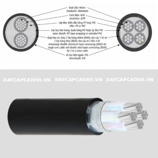 - Giáp bảo vệ: Giáp 2 lớp băng thép DSTA cho cáp 3 pha 4 lõi