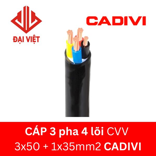 Cáp 3 pha 4 lõi CVV 3×50 + 1x35mm2 CADIVI 0,6/1KV hay dây cáp điện CVV 3×50 + 1x35mm2 CADIVI 0,6/1KV, cáp CVV 3×50 + 1×35 CADIVI 0,6/1KV 3 pha 1 trung tính,… là loại cáp điện lực hạ thế, loại 3 pha 4 lõi, (3 pha 50mm2, 1 trung tính 35mm2), ruột đồng, cách điện PVC, vỏ PVC.