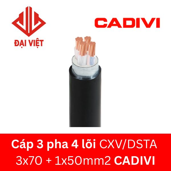 Cáp 3 pha 4 lõi CXV/DSTA 3×70 + 1x50mm2 CADIVI 0,6/1KV hay cáp CXV/DSTA 3×70 + 1x50mm2 CADIVI 0,6/1KV, cáp 3 pha 1 trung tínhCXV/DSTA 3×70 + 1x50mm2 CADIVI 0,6/1KV,… là loại cáp điện lực 3 pha 4 lõi ngầm hạ thế, tiết diện 70mm2 (3 pha 70mm2, 1 trung tính 50mm2), ruột đồng, cách điện XLPE, giáp băng kim loại, vỏ PVC.