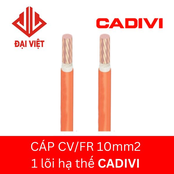Dòng cáp CV/FR 10mm2 CADIVI 0,6/1KV thuộc cáp điện lực hạ thế chống cháy – điện áp 0,6/1kV – tiêu chuẩn AS/NZS 5000.1, IEC 60331-21, IEC 60332-3 CAT C, BS 6387 CAT C; loại 1 lõi, ruột dẫn đồng, có băng FR-Mica, cách điện FR-PVC.