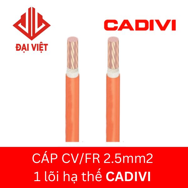 Dòng cáp CV/FR 2.5mm2 CADIVI 0,6/1KV thuộc cáp điện lực hạ thế chống cháy – điện áp 0,6/1kV – tiêu chuẩn AS/NZS 5000.1, IEC 60331-21, IEC 60332-3 CAT C, BS 6387 CAT C; loại 1 lõi, ruột dẫn đồng, có băng FR-Mica, cách điện FR-PVC.