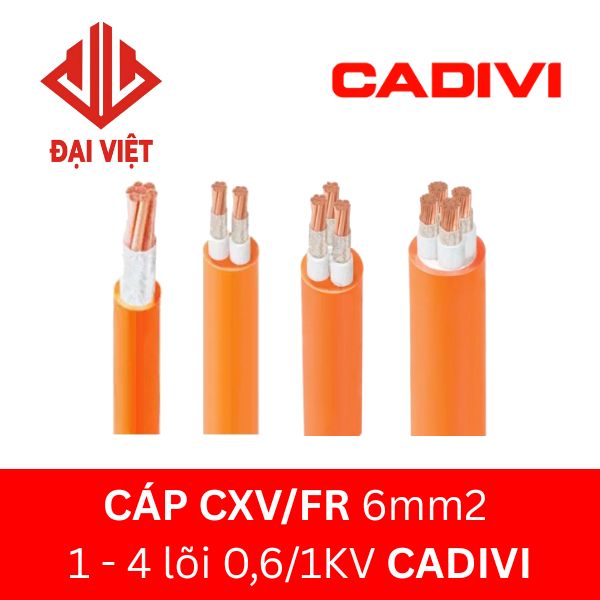 Dòng cáp CXV/FR 6mm2 CADIVI 0,6/1KV thuộc cáp điện lực hạ thế chống cháy – theo tiêu chuẩn TCVN 5935-1/IEC 60502-1, IEC 60332-3 CAT C, BS 6387 CAT C; cấu tạo từ 1 đến 4 lõi, ruột dẫn đồng, có băng Mica, cách điện XLPE và vỏ bọc FR-PVC.