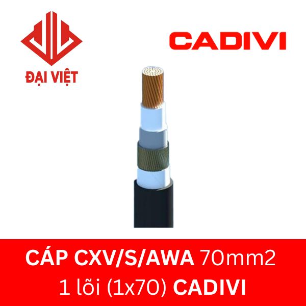 Cáp CXV/S/AWA 70mm2 CADIVI 24KV 1 lõi hay dây cáp điện CXV/S/AWA 70mm2 CADIVI 24KV, cáp CXV/S/AWA 1×70 CADIVI trung thế,… là loại cáp trung thế, ruột đồng, tiết diện 70mm2, 1 lõi, cách điện XLPE và có lớp bọc kim loại nhôm dạng sợi (AWA – Aluminium Wire Armour), vỏ PVC.