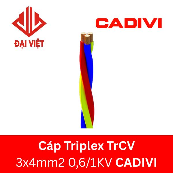 Cáp TrCV 3x4mm2 CADIVI 0,6/1KV là loại cáp triplex (cáp ba, 3 lõi), ruột đồng, tiết diện 4mm2, cách điện PVC của thương hiệu CADIVI thuộc dòng cáp triplex CADIVI 0,6/1KV.
