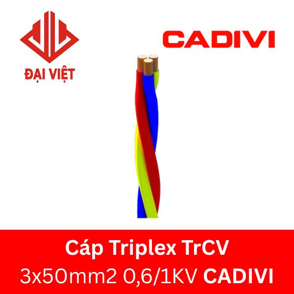 Cáp TrCV 3x50mm2 CADIVI 0,6/1KV là loại cáp triplex (cáp ba, 3 lõi), ruột đồng, tiết diện 50mm2, cách điện PVC của thương hiệu CADIVI thuộc dòng cáp triplex CADIVI 0,6/1KV.