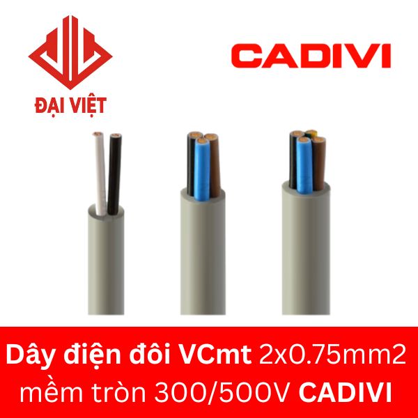 Dây điện đôi VCmt 2×0.75mm2 CADIVI 300/500V hay dây cáp điện VCmt 2×0.75mm2 CADIVI, dây VCmt 2×0.75mm2 CADIVI… là dây điện đôi mềm tròn (Round flexible wire) của thương hiệu CADIVI, ruột đồng, lõi đồng (2 lõi đồng, 3 lõi đồng, 4 lõi đồng), tiết diện 0.75mm2, loại dây đôi mềm tròn dùng cho các thiết bị điện dân dụng.