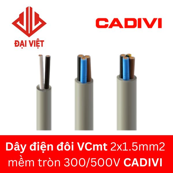 Dây điện đôi VCmt 2×1.5mm2 CADIVI 300/500V hay dây cáp điện VCmt 2×1.5mm2 CADIVI, dây VCmt 2×1.5mm2 CADIVI… là dây điện đôi mềm tròn (Round flexible wire) của thương hiệu CADIVI, ruột đồng, lõi đồng (2 lõi đồng, 3 lõi đồng, 4 lõi đồng), tiết diện 1.5mm2, loại dây đôi mềm tròn dùng cho các thiết bị điện dân dụng.